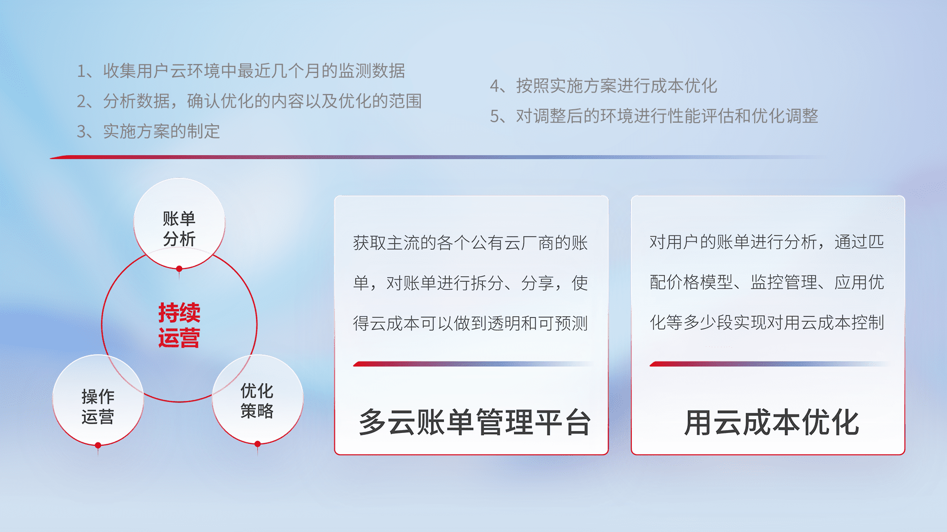 通过多云纳管,,,以统一的资源数据模型把客户的云资源进行抽象和封装,,进而实现对多云资源的统一操作,,保障云资源管理的可靠性、、、稳定性与可用性。。。量身定制化运维内容,,配置、、、开发运维、、补丁管理、、、、备份、、监控、、认证和访问管理、、、审计和日常巡检等,,,,保障在用云过程中的可靠度,,稳定度以及高可用率。。。。
